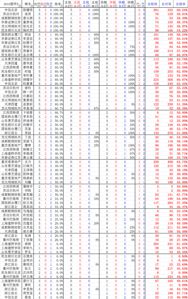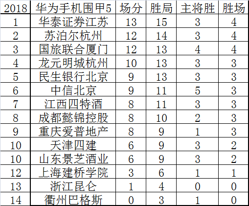 5月9日,2018华为手机杯中国围棋甲级联赛第5轮在各主场战罢。国旅联合厦门客场逆袭苏泊尔杭州全取3分,山东景芝酒业同样做客衢州4-0大胜衢州巴格斯,民生银行北京、华泰证券江苏、中信北京、重庆爱普地产也斩获3分,成都懿锦控股2-2主将战胜龙元明城杭州。5轮战罢,华泰证券江苏积13分领跑积分榜,苏泊尔杭州与国旅联合厦门同积12分,因胜局数刚好多1场,位居积分榜次席,第三。另外天津四建和。本轮中韩焦点战,柯洁胜朴廷桓、范廷钰胜李世石、连笑胜李东勋、刘曦负崔哲瀚、李维清负金志锡、陶欣然胜李映九。韩国外援本轮6战2胜4负。其它焦点场次,辜梓豪主将胜檀啸、李喆主将负陈耀烨、芈昱廷主将胜唐韦星。5月14日,围甲第6轮将在各主场再燃烽火。苏泊尔杭州本轮在杭州天元大厦设擂迎战国旅联合厦门,两队主将朴廷桓与柯洁展开焦点对决。本局坐拥主场利的朴廷桓执白,两人此前15盘交手,有14盘白棋取得了胜利,白棋胜率达93.3%,朴廷桓可谓占据天时地利。两人开局前14手,和前一天芮乃伟执黑与人工智能星阵围棋的手法一模一样,第15手柯洁弈出“碰”的新手,似是有备而来。棋至中盘,朴廷桓在黑阵中强手一断,激起柯洁反击,最后虽然朴廷桓,无奈周围被黑棋走得铁厚无比,柯洁一举占优。素来行棋快速的柯洁本局频频长考,足以说明对这盘棋胜利的渴望,的确他对这一盘的胜利十足渴望,而劣势下的朴廷桓自然不甘束手就擒,利用余味四处挑劫,但都被柯洁一一化解,最终柯洁展示精准算力,战至227手柯洁一扳封喉,朴廷桓无奈认负。本局战况激烈,也属于年度难得的“大杀局”。否极泰来携矢志,云帆直挂道归来。柯洁大破朴廷桓的“执白局”,也为国旅联合厦门拿下宝贵的主将胜,最终柯洁在队友的绝佳配合下,在客场3-1大胜苏泊尔杭州。赛季初喊出的强势口号“国旅厦门,夺冠热门”诚不人欺。前四轮颗粒无收的衢州巴格斯队本轮在衢州信安阁对阵山东景芝酒业队,韩国外援李世石九段出任主将对阵范廷钰九段,范廷钰刚刚获得了在浙江平湖进行的CCTV电视快棋赛冠军,气势正盛。李世石开局不久就走出了一手令人瞠目的团,两人在左下角,当即演绎出一型新颖的变化。随后战斗中,范廷钰逐渐占据优势。面对不利局面,李世石在下方强硬打入,意欲再演“僵尸流”绝技,无奈范廷钰招招应对强硬无比,最终李世石打入数子被对手悉数收下,棋局也就失去悬念,最后李世石顽强收完官子,小败局面仍然难免,229手李世石无奈投子。值得一提的是,本轮江西四特酒主场迎战重庆爱普地产队,客队古力九段执黑对阵比自己小了20岁的新锐屠晓宇三段,今年战绩不佳的古力九段执黑弈得,虽然新锐顽强追赶,但八冠王古力牢牢把握主动,173手中盘获胜,取得一场淋漓畅快的胜局。这也是古力二十年围甲之旅的第400盘对局。半生仗剑飞华发,归来仍是古少年。第20届华为手机杯围甲第5轮具体赛果:成都懿锦控股 2-2 龙元明城杭州(成都锦江围棋会馆)一台 崔哲瀚九段 胜 刘曦五段二台 廖元赫六段 胜 丁浩五段 主将三台 古灵益六段 负 邬光亚六段 快棋四台 党毅飞九段 负 夏晨琨六段江西四特酒 1-3 重庆爱普地产(南昌嘉莱特酒店)一台 许嘉阳七段 负 杨鼎新六段二台 辜梓豪九段 胜 檀啸九段 主将三台 杨楷文六段 负 李轩豪七段 快棋四台 屠晓宇三段 负 古力九段浙江昆仑 1-3 中信北京(金华浦江仙华会议中心)一台 张涛六段 负 柁嘉熹九段二台 李喆六段 负 陈耀烨九段 主将三台 蒋其润五段 胜 蔡竞六段四台 周贺玺六段 负 韩一洲七段 快棋华泰证券江苏 3-1 天津四建(同里)一台 童梦成六段 胜 谢尔豪九段 快棋二台 芈昱廷九段 胜 唐韦星九段 主将三台 黄云嵩六段 负 孟泰龄六段四台 赵晨宇六段 胜 王泽锦六段民生银行北京 3-1 上海建桥学院(抚州荣誉酒店)一台 孙腾宇七段 负 胡耀宇八段 快棋二台 时越九段 胜 范蕴若六段 主将三台 金志锡九段 胜 李维清五段四台 陶欣然六段 胜 李映九九段衢州巴格斯 0-4 山东景芝酒业(衢州信安阁)一台 胡钰函五段 负 伊凌涛五段 快棋二台 李世石九段 负 范廷钰九段 主将三台 钟文靖六段 负 陈梓健六段四台 丁世雄四段 负 江维杰九段苏泊尔杭州 1-3 国旅联合厦门(杭州天元大厦)一台 李钦诚九段 负 周睿羊九段 快棋二台 朴廷桓九段 负 柯洁九段 主将三台 谢科五段 负 范胤七段四台 连笑九段 胜 李东勋九段(胡波)